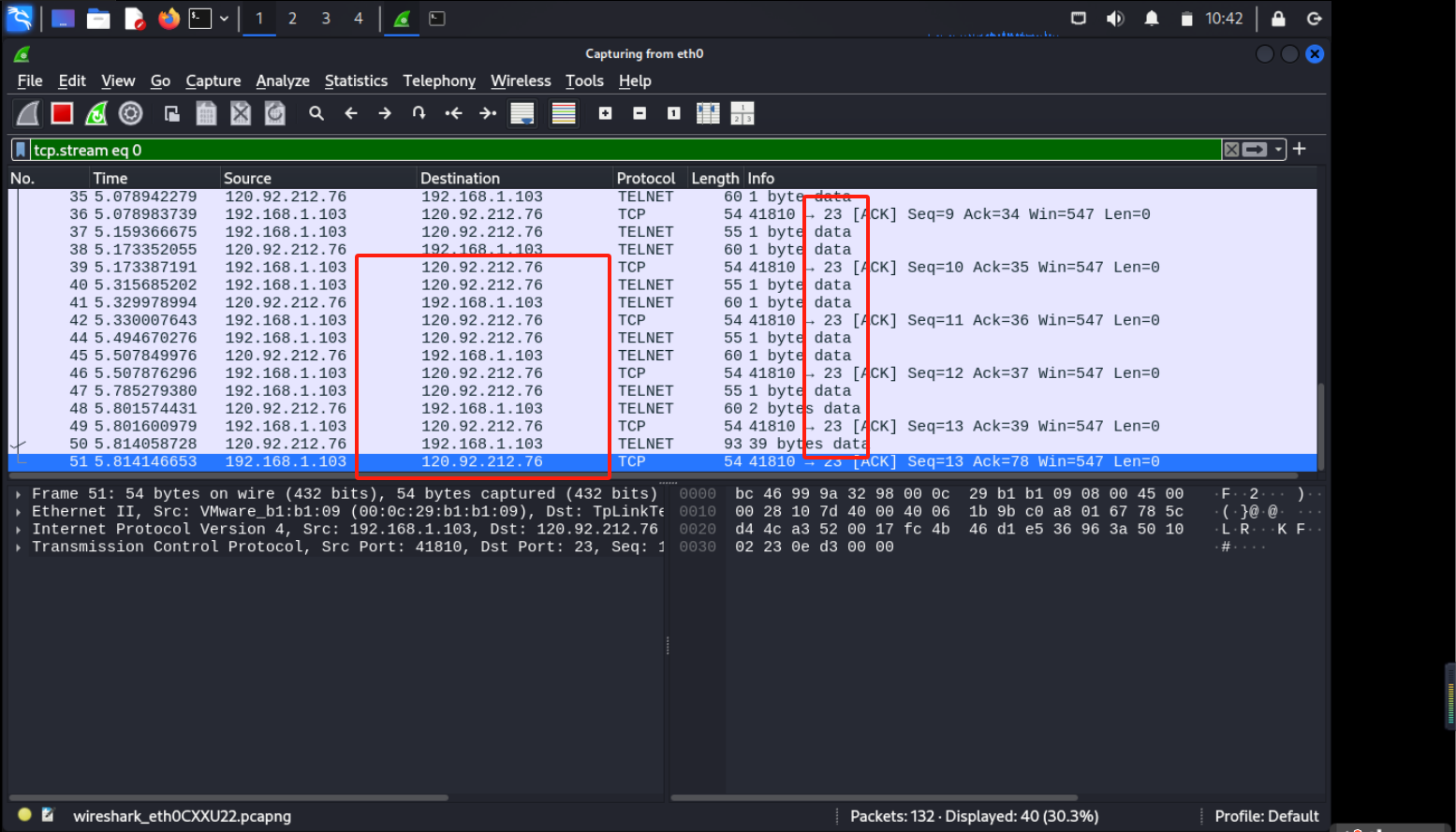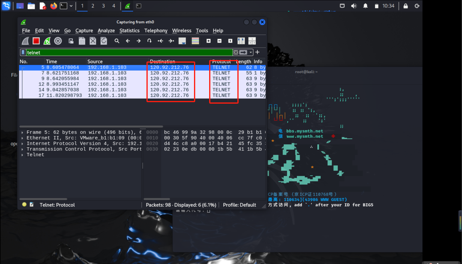 开启wireshark抓包,可见其ip和端口为120.92.212.76:23: