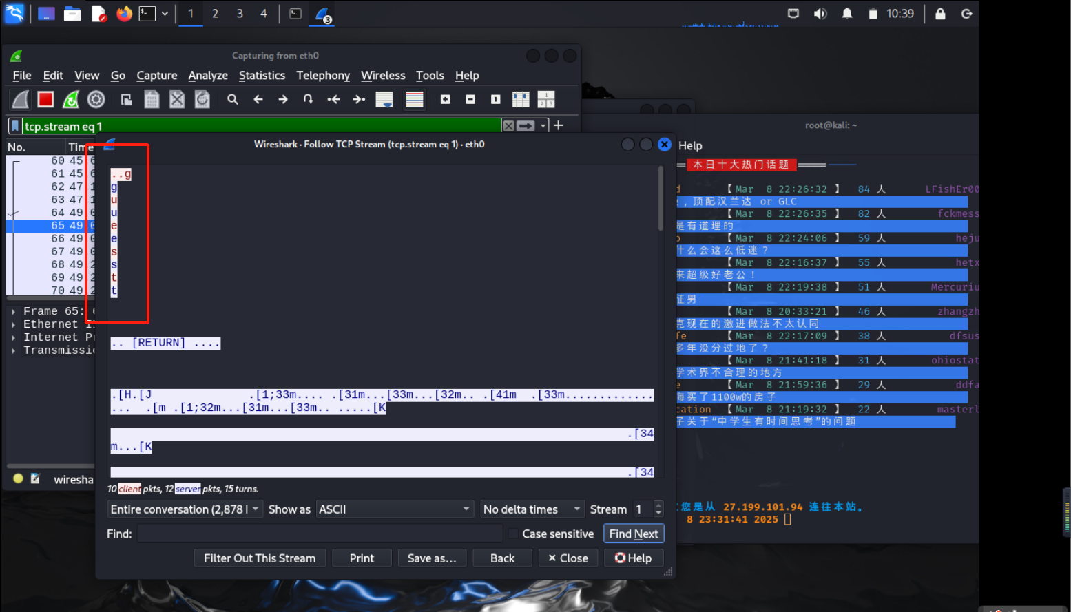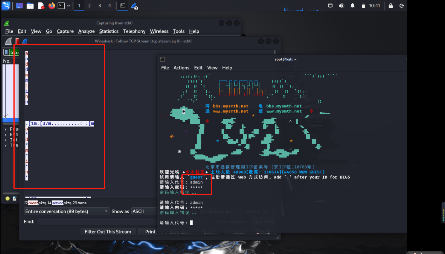 跟踪TCP流,分别以guest和admin/admin登录该社区,通过观察数据包可发现登录用户名和口令以明文方式传输: