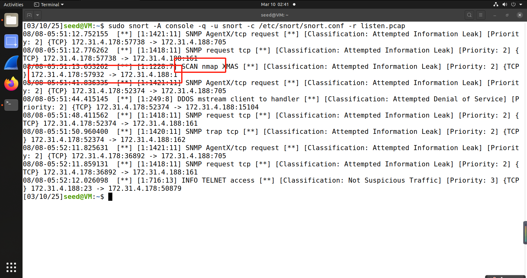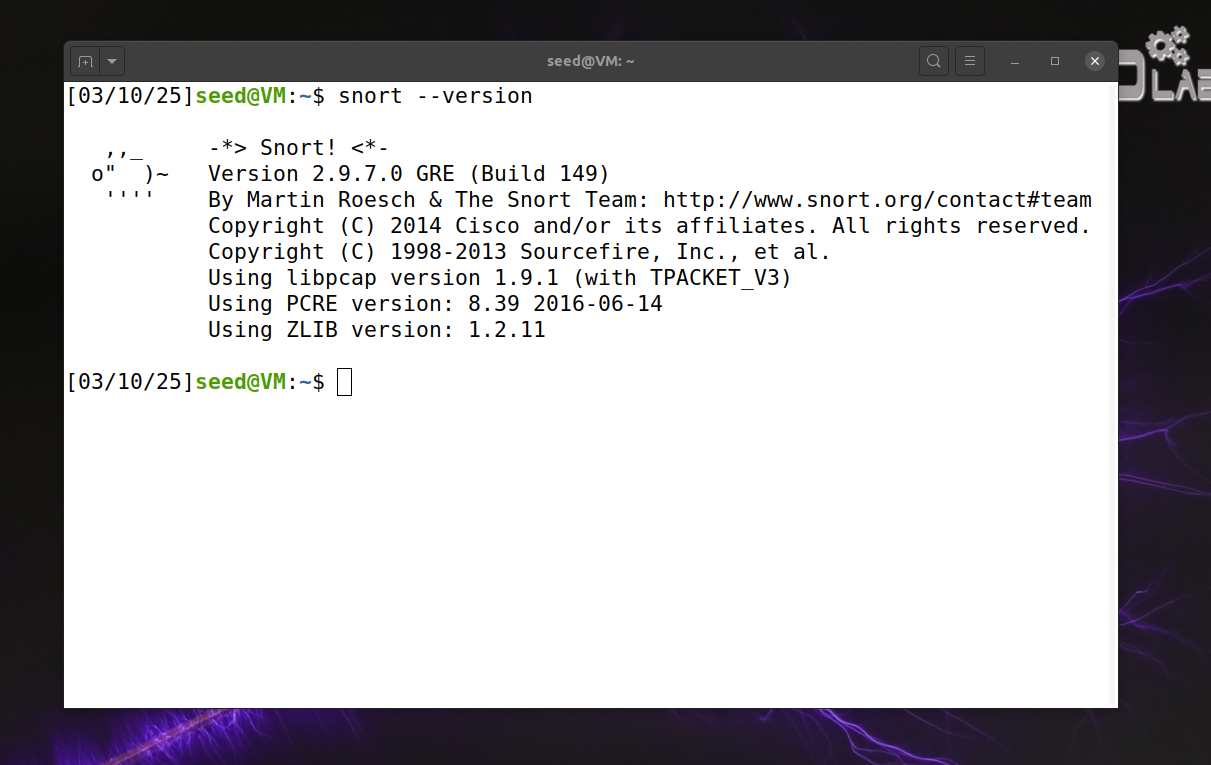 - 问题2解决方案:在seedlab中安装snort,版本为2.x,可以得到想要的输出