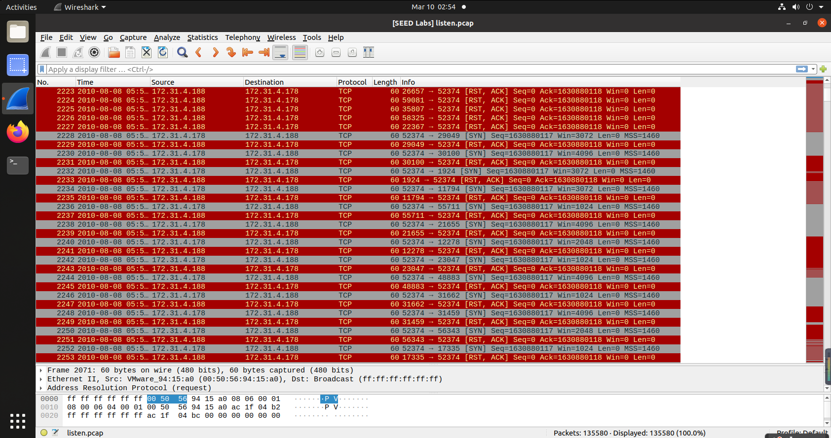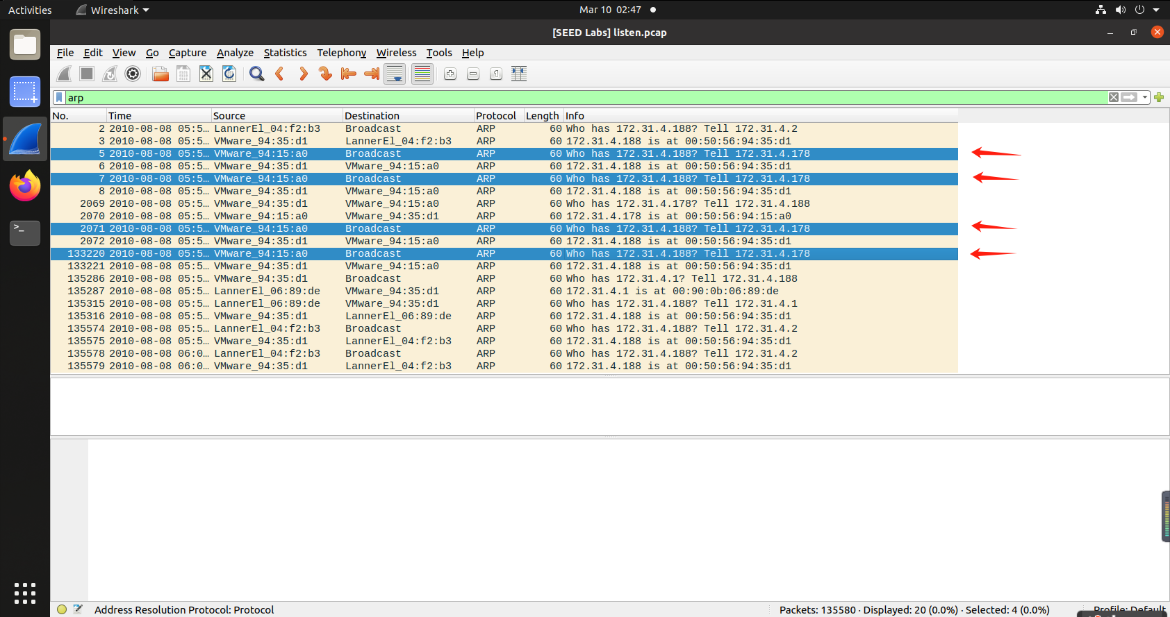 筛选arp包,攻击机在攻击之前会对靶机进行询问,可见共进行了4次询问: