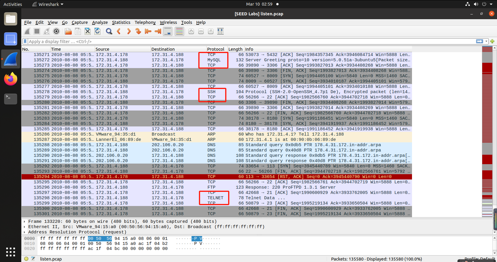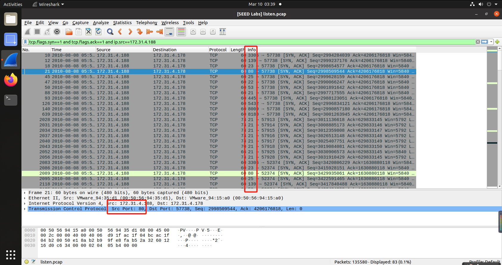 在wireshark中以条件tcp.flags.syn==1 and tcp.flags.ack==1 and ip.src==172.31.4.188进行数据包筛选,发现目标开启端口21,22,23,25,53,80,445,3306,5432,8009,8180: