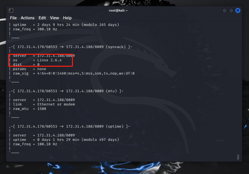 输入命令sudo p0f -r listen.pcap,可见攻击机系统为linux 2.6.x: