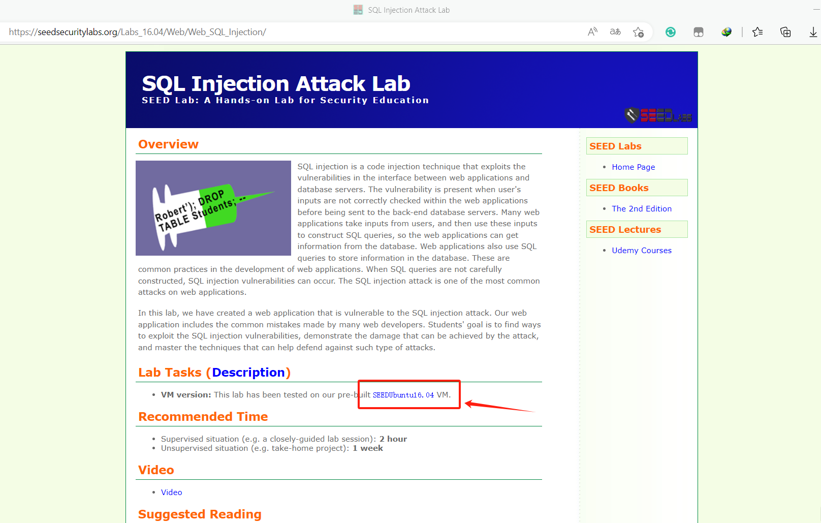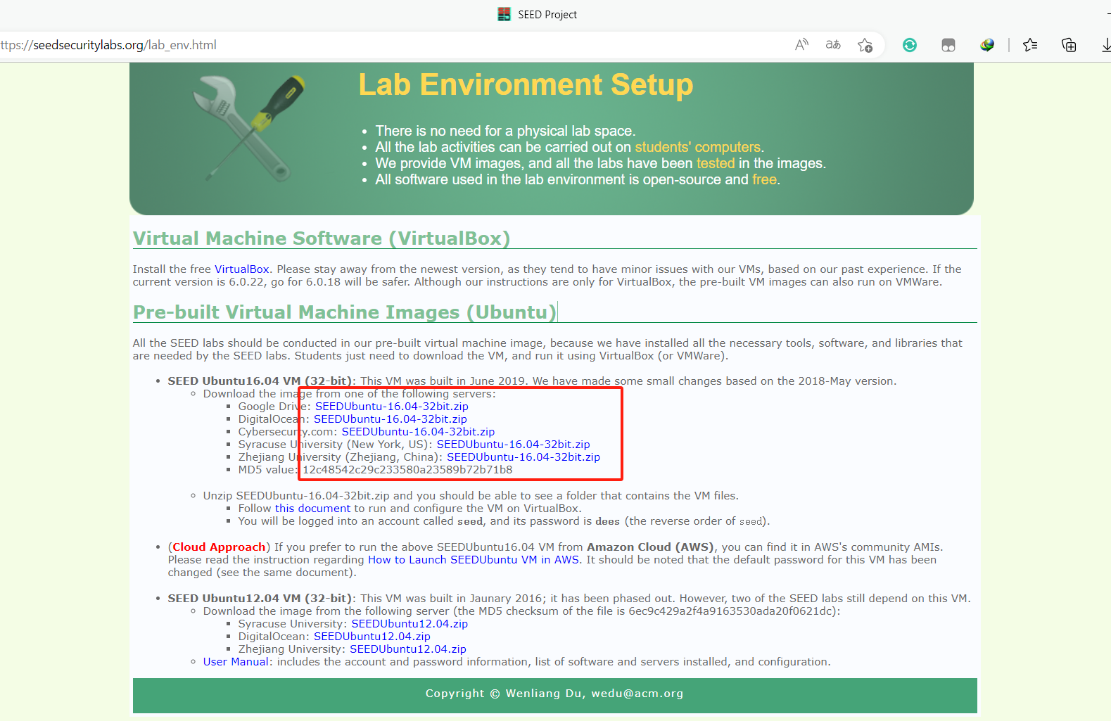 - 问题1解决方案:通过大量的搜索得知,两个实验基于seedlab_ubuntu16.04,原有的旧系统和ubuntu20系统均无法直接实验,下载16.04镜像后进行实验