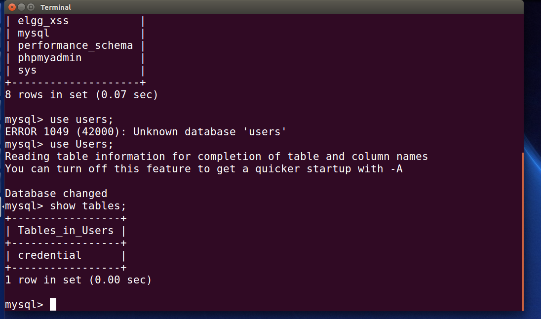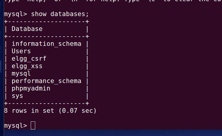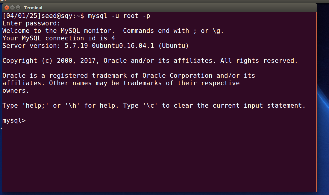 输入命令mysql -u root -p登录mysql数据库(密码seedubuntu):