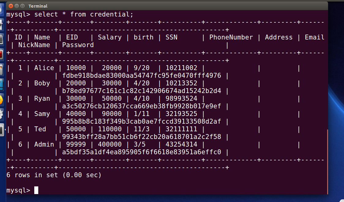 $sql = $conn->prepare("SELECT id, name, eid, salary, birth, ssn, phoneNumber, address, email, nickname, Password From credential WHERE name= ? and Password=?;"); $sql->bind_param("ss",$input_uname,$hashed_pwd);