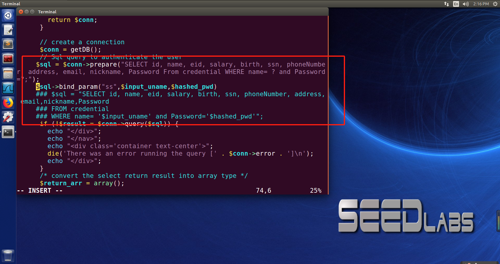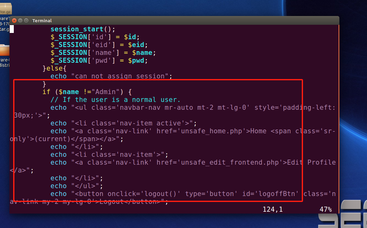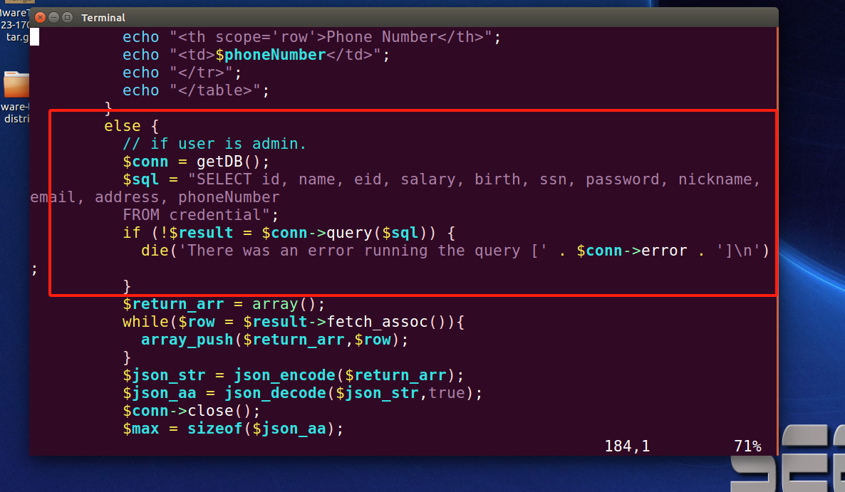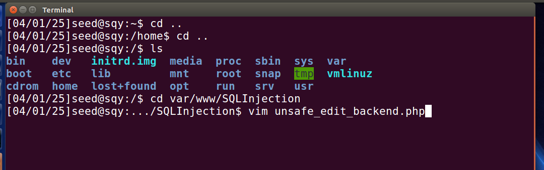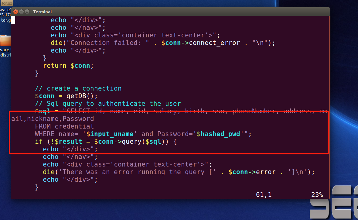 输入命令vim /var/www/SQLInjection/unsafe_home.php,对unsafe_home.php进行分析: