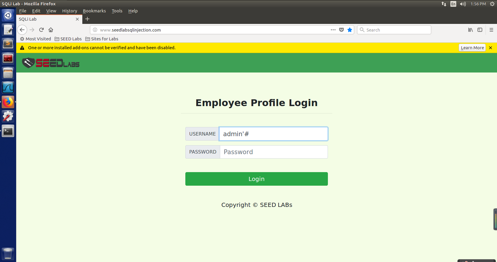 通过分析上述SQL语句,在用户名后构造闭合语句'#进行注入攻击,成功登录后台: