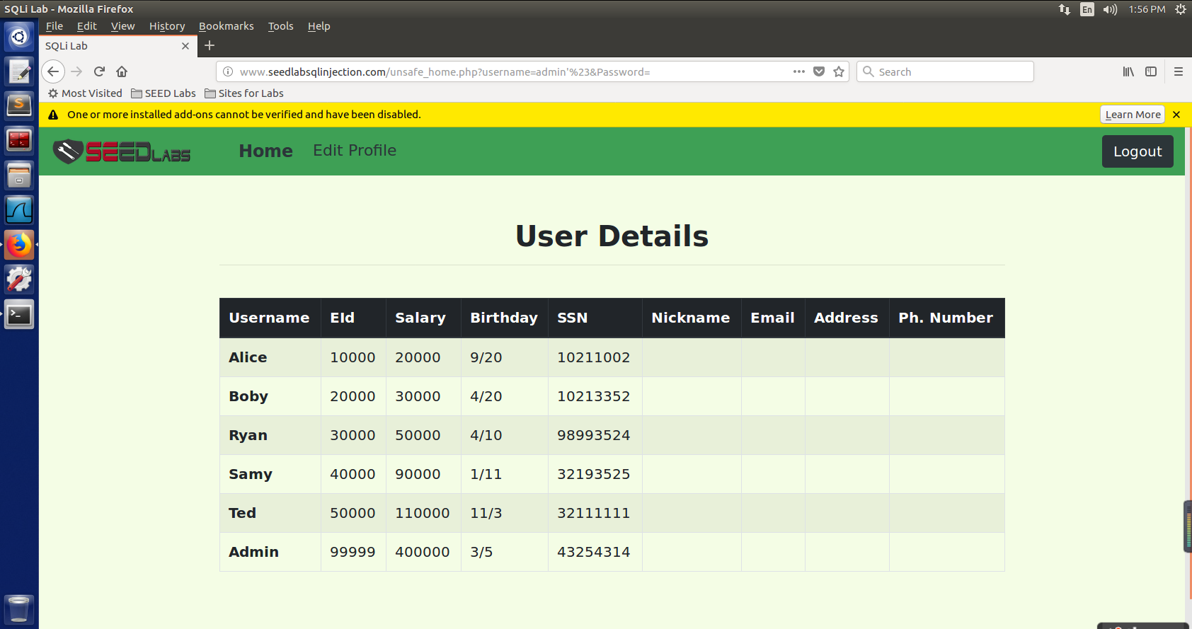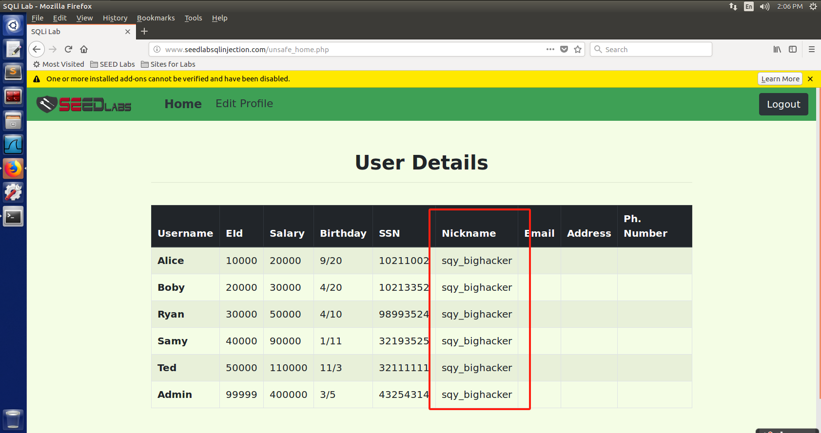 Boby被感染后,Samy(密码seedsamy)访问Boby主页,其信息也被修改: