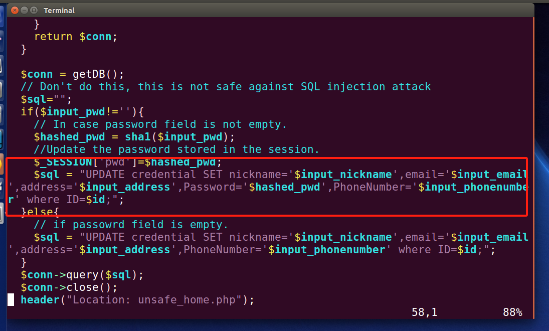 输入命令vim /var/www/SQLInjection/unsafe_edit_backend.php对update语句进行分析:
