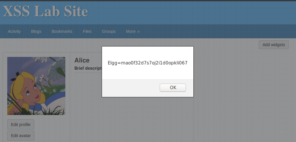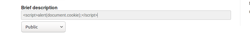 在Brief description一栏中插入XSS攻击代码<script>alert(document.cookie);</script>,显示COOKIE: