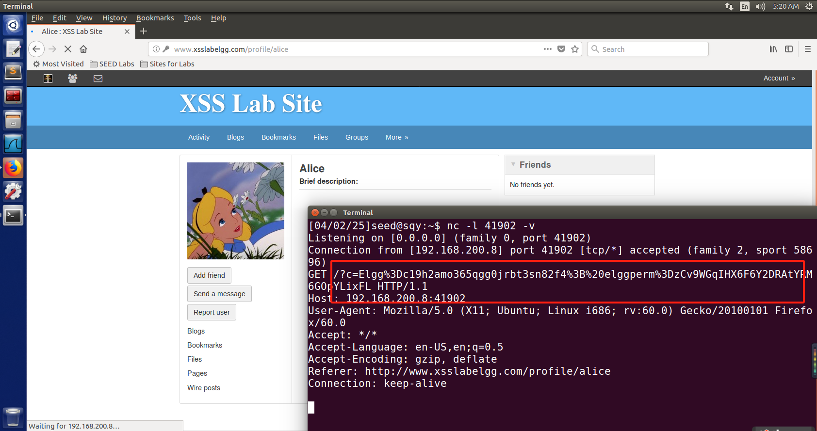 登录Boby的账号(密码seedboby),访问Alice主页,终端捕获到Boby的COOKIE: