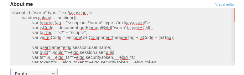 登录Alice的账号,在About me一栏中(HTML模式)插入XSS攻击代码,以实现XSS蠕虫攻击: