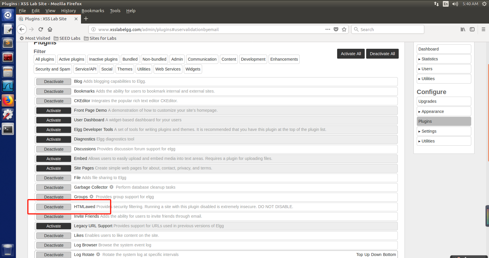 登录Admin账号(密码seedelgg),点击Account->Administration->plugins,将HTMLawed设为Deactivate状态: