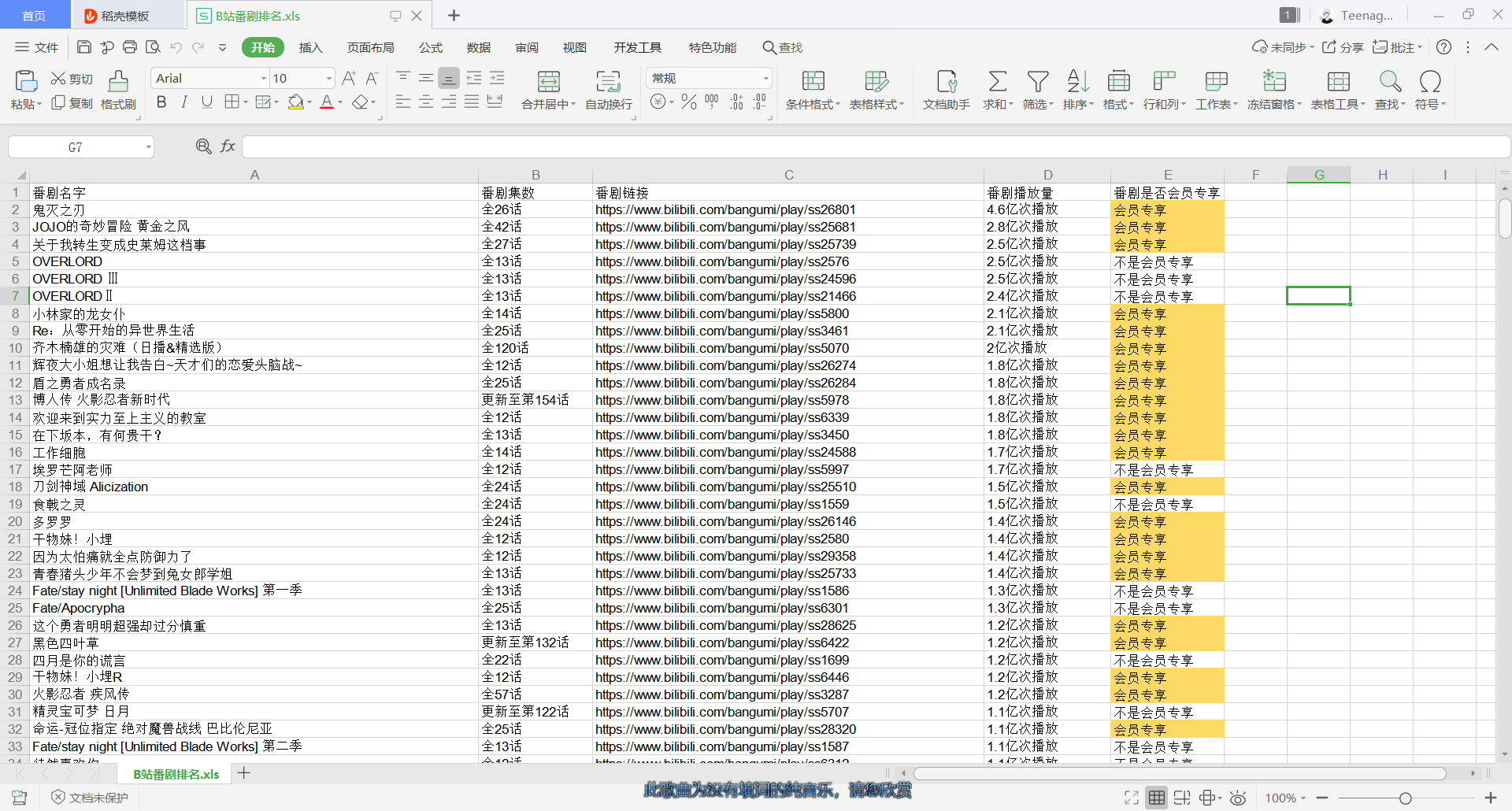 1 import xlwt 2 import requests 3 4 5 # 功能:实现B站番剧排名的爬取 6 7 8 def main(): 9 datalist = askUrl() 10 saveData(datalist) # 保存数据 11 12 13 def askUrl(): 14 url = "https://api.bilibili.com/pgc/season/index/result" 15 headers = { 16 "User - Agent": "Mozilla/5.0 (Windows NT 10.0; Win64; x64) AppleWebKit/537.36 (KHTML, like Gecko) Chrome/81.0.4044.138 Safari/537.36" 17 } 18 datalist = [] 19 for page in range(1,157): 20 params = { 21 'st': '1', 22 'order': '2', 23 'season_version': '-1', 24 'area': '-1', 25 'is_finish': '-1', 26 'copyright': '-1', 27 'season_status': '-1', 28 'season_month': '-1', 29 'year': '-1', 30 'style_id': '-1', 31 'sort': '0', 32 'page': str(page), 33 'season_type': '1', 34 'pagesize': '20', 35 'type': '1', 36 } 37 response = requests.get(url, params=params, headers=headers) 38 html = response.json() 39 data = html["data"]["list"] # 数据位置 40 for anime in data: 41 data = [] 42 title = anime["title"] # 番剧名字 43 data.append(title) 44 45 episode = anime["index_show"] # 番剧集数 46 data.append(episode) 47 48 link = anime["link"] # 番剧链接 49 data.append(link) 50 51 playVolume = anime["order"] # 番剧播放量 52 data.append(playVolume) 53 54 ifVip = anime["badge"] # 是否会员专享 55 if ifVip == "": 56 data.append("不是会员专享") 57 else: 58 data.append(ifVip) 59 60 datalist.append(data) # y一部番剧的所有信息 61 print("第%d页已爬取完毕!"%page) 62 return datalist 63 64 65 def saveData(datalist): 66 savepath = "B站番剧排名.xls" #表格路径 67 workbook = xlwt.Workbook(encoding="utf-8") # 创建workbook对象 68 # 创建一个worksheet对象,第二个参数是指单元格是否允许重设置,默认为False 69 worksheet = workbook.add_sheet(savepath,cell_overwrite_ok=True) # 创建工作表 70 col = ("番剧名字","番剧集数","番剧链接","番剧播放量","番剧是否会员专享") 71 for i in range(0,5): 72 # 设置列宽,计算列宽度:256是单元格基数*用数据长度*2最终的结果单元格的宽度和数据正好填满 73 # worksheet.col(i).width = 256 * len(col[i]) * 2 # 自适应列宽 74 worksheet.write(0,i,col[i]) # 第一行的数据(列名) 75 for i in range(0,3119): # 第几行 76 data = datalist[i] 77 for j in range(0,5): # 第几列 78 worksheet.write(i+1,j,data[j]) 79 workbook.save(savepath) 80 81 82 if __name__ == '__main__': 83 main()
