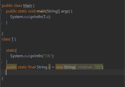 ②比较第三种情况和其他两种情况,由于“JD”字符串在编译期就进入了常量池中,所以静态变量不需要经过类的加载机制就已经完成初始化,因此第三种情况的静态代码块没有执行。