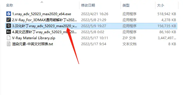 7,运行汉化补丁,双击“汉化补丁vray_adv_52023_max2020_v1.0.exe”打开汉化补丁
