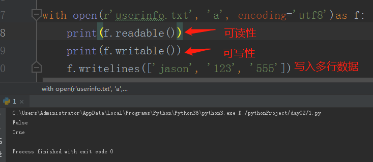 # 方法补充 with open(r'userinfo.txt','a',encoding='utf8') as f: print(f.readable()) # True print(f.writable()) # False f.writelines(['jason','123','555']) """ 1.flush() 将内存中的数据立刻刷到硬盘 相当于保存文件 2.readable() writeable() 判断文件是否可读可写 3.writelines() 括号内放列表 多个元素都会被依次写入 """
