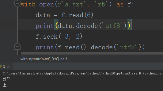 # 文件光标移动 及 文件修改 """ seek方法可以控制光标的移动 seek(offset,whence) offset用来控制移动的位数 whence是操作模式 0:既可以用在文本模式也可以用在二进制模式 文件开头 1:只可以在二进制模式下使用 当前位置 2:只可以在二进制模式下使用 文件末尾 """ # with open(r'a.txt', 'r', encoding='utf8') as f: # data = f.read() # print(data) # # 控制光标移动 # f.seek(1, 0) # 移动到文件开头并往后再移动一个字符 # print(f.read()) # with open(r'a.txt', 'rb') as f: # data = f.read(4) # print(data.decode('utf8')) # # 控制光标移动 # f.seek(-3, 2) # 二进制模式下移动的是字节数,一个中文字符为三个字节 # print(f.read().decode('utf8'))
