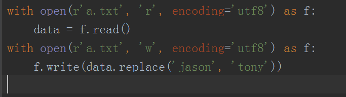 # 文件修改 # with open(r'a.txt','r',encoding='utf8') as f: # data = f.read() # with open(r'a.txt','w',encoding='utf8') as f: # f.write(data.replace('jason','tony'))