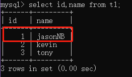 update t1 set name ='jasonNB' where id=1; # 将id是1的name改为指定的数据