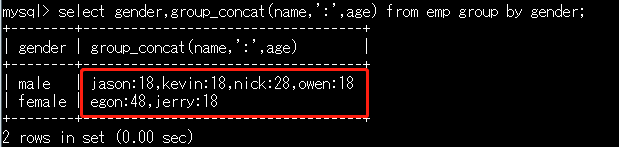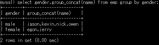 用于分组之后 获取除了分组以外还符合条件的其他字段数据 本质是拼接操作 select post,group_concat(name) from emp group by post; select post,group_concat(name,'|',salary) from emp group by post; # 可以支持多个字段一起合并获取