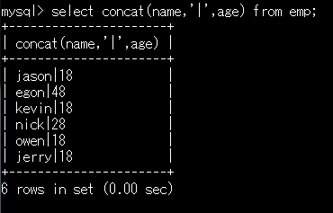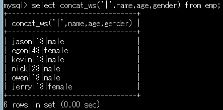 select concat_ws('|',name,age,salary,gender) from emp; # 用于分组前 适用于多个字段相同的分隔符,可以自动分隔