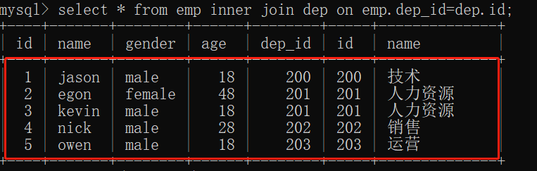 select * from emp innner join dep on emp.dep_id=dep.id; # 只链接两种表中都有对应的数据