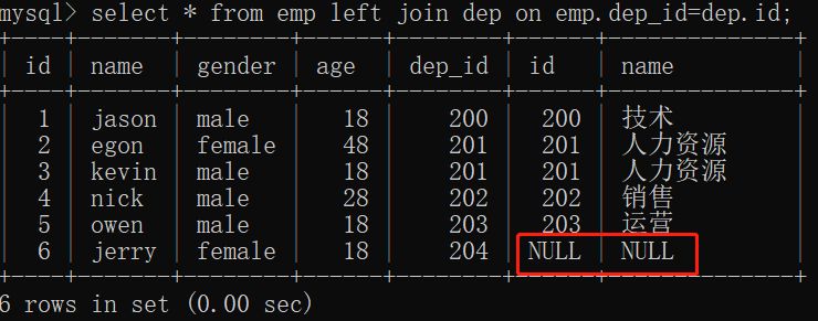 select * from emp right join dep on emp.dep_id=dep.id; # 以关键字左表为基础表展示左表所有的数据,没有对应的以null填充