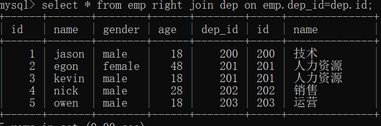 select * from emp right join dep on emp.dep_id=dep.id; # 以关键字右表为基础展示右表所有的数据,没有对应的用null来填充