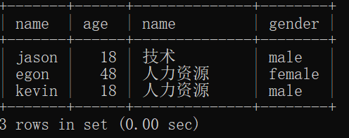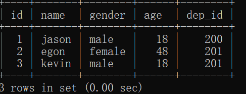 create table dep( id int primary key auto_increment, name varchar(20) ); create table emp( id int primary key auto_increment, name varchar(20), gender enum('male','female') not null default 'male', age int, dep_id int ); #插入数据 insert into dep values (200,'技术'), (201,'人力资源'), (202,'销售'), (203,'运营'); insert into emp(name,gender,age,dep_id) values ('jason','male',18,200), ('egon','female',48,201), ('kevin','male',18,201), ('nick','male',28,202), ('owen','male',18,203), ('jerry','female',18,204);