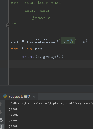 # ret = re.findall('j.*?n', 's')  # 返回所有满足匹配条件的结果,放在列表里