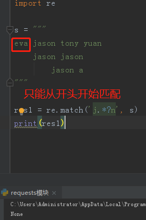 # 只能从头开始匹配 头部不符合直接停止 res1 = re.match('j.*?n', s) print(res1)