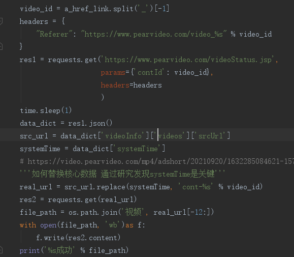 import requests from bs4 import BeautifulSoup # 定义根目录地址 base_url = 'https://www.pearvideo.com/' # 1.发送get请求获取页面数据 res = requests.get('https://www.pearvideo.com/category_31') # 2.使用bs4模块解析 soup = BeautifulSoup(res.text, 'lxml') # 3.研究视频详情链接 li_list = soup.select('li.categoryem') # 4.循环获取每个li里面的a标签 for li in li_list: a_tag = li.find(name='a') a_href_link = a_tag.get('href') # video_1742158 # second_link = base_url + a_href_link # https://www.pearvideo.com/video_1742158 '''研究发现详情页视频数据并不是直接加载的 也就意味着朝上述地址发送get请求没有丝毫作用''' """ video_1742158 内部动态请求的地址 https://www.pearvideo.com/videoStatus.jsp?contId=1742158&mrd=0.9094028515390931 contId: 1742158 mrd: 0.9094028515390931 0到1之间的随机小数 动态请求之后返回的核心数据 https://video.pearvideo.com/mp4/adshort/20210920/1632283823415-15771122_adpkg-ad_hd.mp4 真实视频地址 https://video.pearvideo.com/mp4/adshort/20210920/cont-1742158-15771122_adpkg-ad_hd.mp4 """ # 通过研究发现详情页数据是动态加载的 所以通过network获取到地址 video_id = a_href_link.split('_')[-1] headers = { "Referer": "https://www.pearvideo.com/video_%s" % video_id } res1 = requests.get('https://www.pearvideo.com/videoStatus.jsp', params={'contId': video_id}, headers=headers ) data_dict = res1.json() src_url = data_dict['videoInfo']['videos']['srcUrl'] systemTime = data_dict['systemTime'] # https://video.pearvideo.com/mp4/adshort/20210920/1632285084621-15771122_adpkg-ad_hd.mp4 '''如何替换核心数据 通过研究发现systemTime是关键''' real_url = src_url.replace(systemTime, 'cont-%s' % video_id)