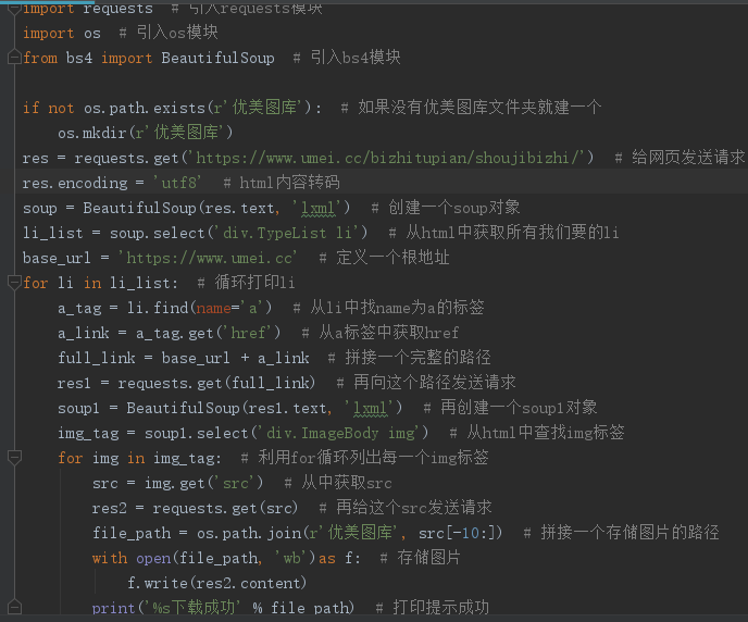 import requests from bs4 import BeautifulSoup import os if not os.path.exists(r'优美图片库'): os.mkdir(r'优美图片库') # 1.朝主页面发送get请求 res = requests.get('https://www.umei.cc/bizhitupian/diannaobizhi/') '''当使用.text方法之前最好先确认一下页面数据是否乱码''' res.encoding = 'utf-8' # 容易忽略 # 2.获取二次详情页地址链接 soup = BeautifulSoup(res.text, 'lxml') # 由于页面上有很多列表标签 我们需要先进行区分 所以先找上一层div标签 div_tag = soup.find(name='div', attrs={'class': 'TypeList'}) # 先获取所有的li标签 li_list = div_tag.find_all(name='li') # for循环一个个li标签 获取内部a标签 # 提前定义根目录地址 base_url = 'https://www.umei.cc' for li in li_list: a_tag = li.find(name='a') a_link = a_tag.get('href') a_full_link = base_url + a_link # 朝一个个链接地址发送请求 res1 = requests.get(a_full_link) '''由于我们只需要链接 并且发现链接没有字符 全是英文 所以此处不需要考虑''' soup1 = BeautifulSoup(res1.text, 'lxml') # 筛选出页面上的图片src地址 img_tag = soup1.select('div.ImageBody img') # 列表 for img in img_tag: src = img.get('src') # 朝图片的地址发送请求获取图片数据 res2 = requests.get(src) file_path = os.path.join(r'优美图片库', src[-10:]) with open(file_path, 'wb') as f: f.write(res2.content) print('图片:%s 下载成功' % file_path)