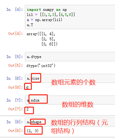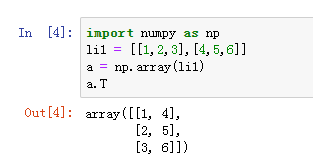 eg: li1 = [ [1,2,3], [4,5,6] ] a = np.array(li1) a.T 执行结果: array([[1, 4], [2, 5], [3, 6]]) # 就相当于是将行变成列,列变成行,它也是一个比较常用的方法