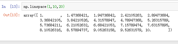 linspace() 类似arange() 第三个参数为数组长度 np.linspace(1,10,20) # 这个方法与arange有一些区别,arange是顾头不顾尾,而这个方法是顾头又顾尾,在1到10之间生成20个数字之间的距离相等的,前后两个数做减法肯定相等