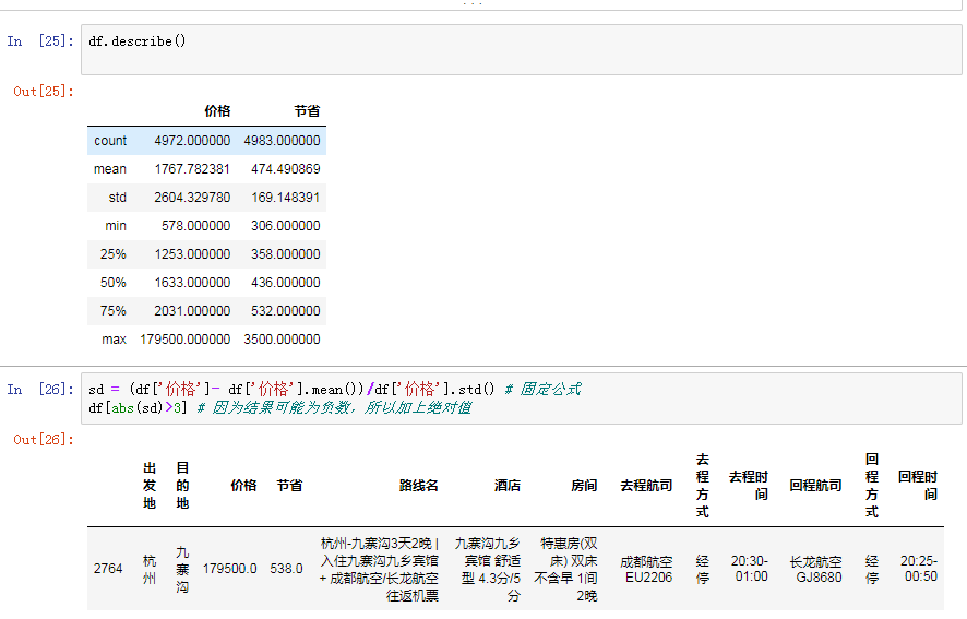 # 利用快速统计大致筛选出可能有异常数据的字段 df.describe() # 价格小于节省 那么可能是价格有问题或者节省有问题 # 利用公式求证我们的猜想 sd = (df['价格'] - df['价格'].mean()) / df['价格'].std() # 判断的标准 # 利用逻辑索引筛选数据 df[(sd > 3)|(sd < -3)] # 利用绝对值 df[abs(sd) > 3] # abs就是绝对值的意思(移除正负号)