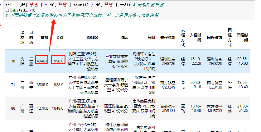 # 同理验证节省是否有异常(不一定要使用) sd1 = (df['节省'] - df['节省'].mean()) / df['节省'].std() # 判断的标准 # 利用逻辑索引筛选数据 df[(sd > 3)|(sd < -3)] # 利用绝对值 df[abs(sd1) > 3] # abs就是绝对值的意思(移除正负号) # 直接简单粗暴找节省大于价格的数据(推荐下列方式) df[df['节省'] > df['价格']]