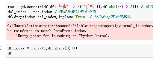 # 删除价格和节省都有异常的数据 # 方式1:先拼接 再一次性删除 横向合并pd.merge() 纵向合并pd.concat() # res = pd.concat([df[df['节省'] > df['价格']],df[abs(sd) > 3]]) # 获取要删除的行数据 索引值 del_index = res.index # 根据索引删除数据 df.drop(index=del_index,inplace=True) # 再次重置索引 df.index = range(0,df.shape[0])bbb # 方式2: 得出一个结果就删一个