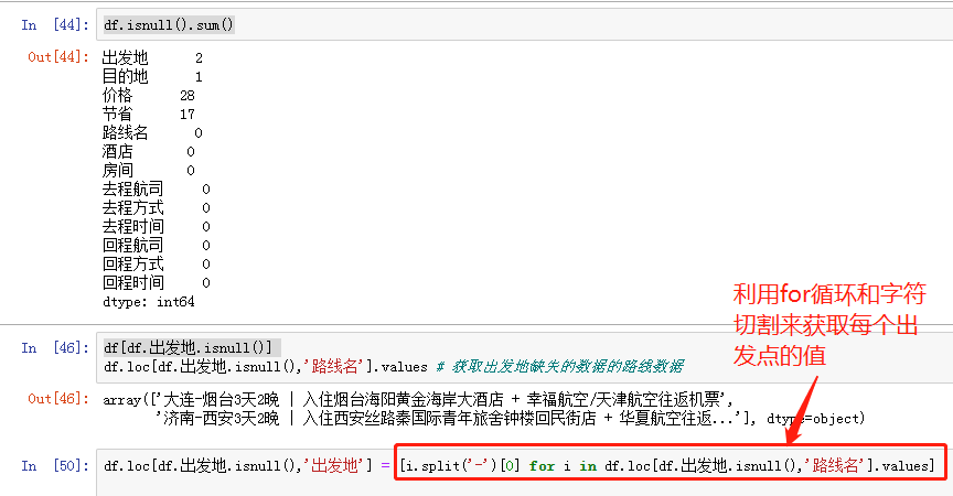 # 查找具有缺失值的列名称 df.isnull().sum() # 统计每个字段缺失数据条数 # 利用布尔值索引筛选出出发地有缺失的数据 df[df.出发地.isnull()] # 获取出发地缺失的数据的路线数据 df.loc[df.出发地.isnull(),'路线名'].values # 利用字符串切割替换出发地缺失数据 df.loc[df.出发地.isnull(),'出发地'] = [i.split('-')[0] for i in df.loc[df.出发地.isnull(),'路线名'].values]