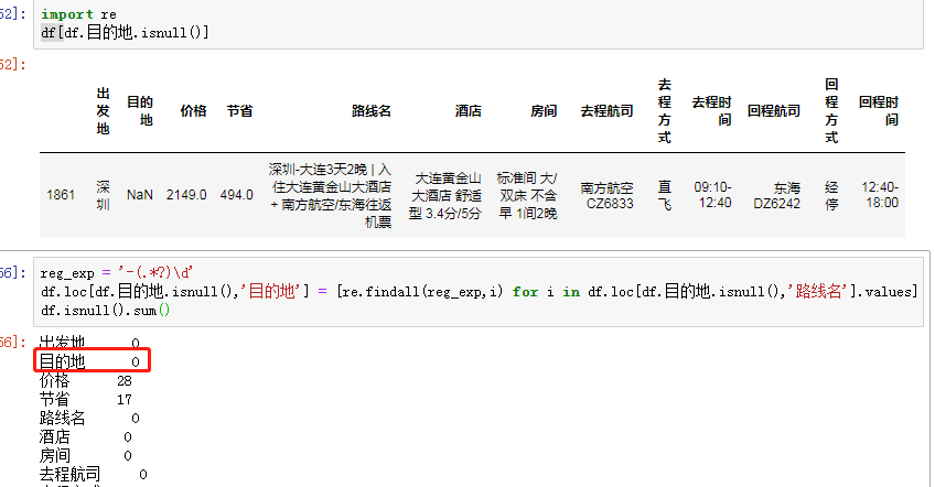 # 针对目的地操作如上(筛选要比出发地难!!!) df[df.目的地.isnull()] # 获取目的地缺失的路线数据 df.loc[df.目的地.isnull(),'路线名'].values # 利用正则筛选出目的地 import re # 写出正则表达式 reg_exp = '-(.*?)\d' df.loc[df.目的地.isnull(),'目的地'] = [re.findall(reg_exp,i) for i in df.loc[df.目的地.isnull(),'路线名'].values]