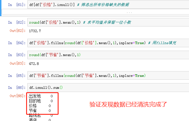# 筛选出所有价格缺失的数据 df[df['价格'].isnull()] # 直接利用价格的均值填充缺失数据 df['价格'].mean() # 1732.5140901771338 round(df['价格'].mean(),1) df['价格'].fillna(round(df['价格'].mean(),1),inplace=True) # 同理针对节省的数据也做中位数填充(其实应该结合实际采用不同的方法) df['节省'].fillna(round(df['节省'].mean(),1),inplace=True) # 验证 df.isnull().sum()
