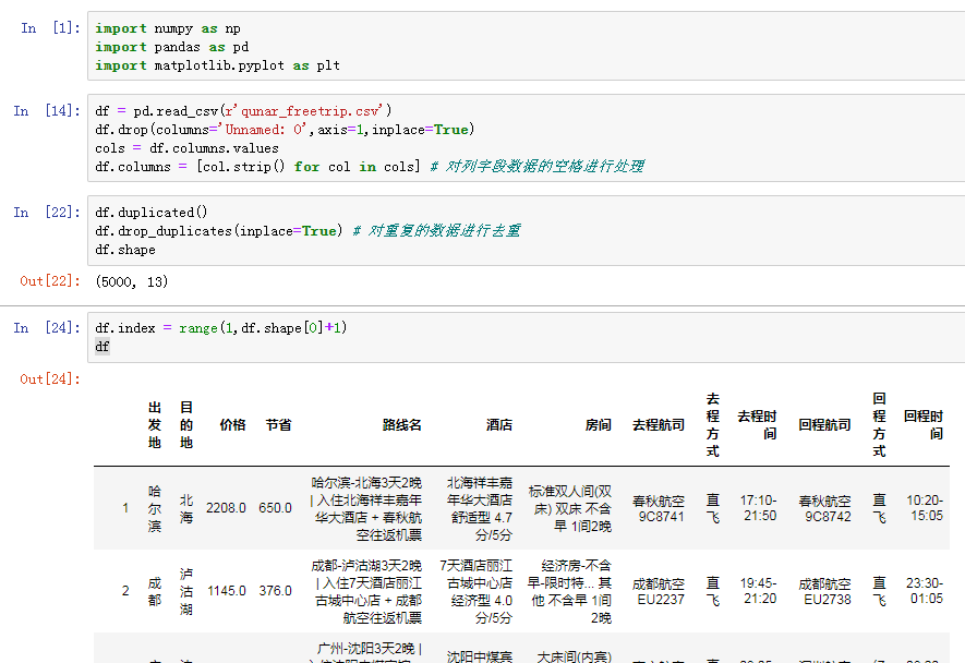 # 先导入数据分析三剑客模块 import numpy as np import pandas as pd import matplotlib.pyplot as plt df = pd.read_csv(r'qunar_freetrip.csv') # 1.查看前五条数据 掌握大概 df.head() # 2.查看表的行列总数 df.shape # 3.查看所有的列字段 df.columns # 发现列字段有一些是有空格的 # 4.查看数据整体信息 df.info() # 发现去程时间和回程时间是字符串类型需要做日期类型转换 # 5.快速统计 df.describe() df.columns