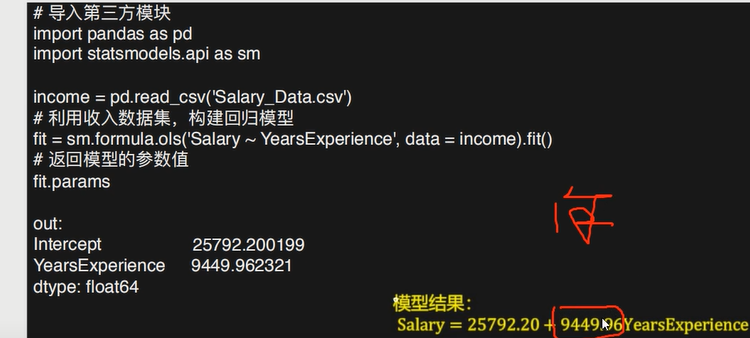 # 生成由State变量衍生的哑变量 dummies = pd.get_dummies(Profit.State) # 将哑变量与原始数据集水平合并 Profit_New = pd.concat([Profit,dummies], axis = 1) # 删除State变量和California变量(因为State变量已被分解为哑变量,New York变量需要作为参照组) Profit_New.drop(labels = ['State','New York'], axis = 1, inplace = True) # 拆分数据集Profit_New train, test = model_selection.train_test_split(Profit_New, test_size = 0.2, random_state=1234) # 建模 model2 = sm.formula.ols('Profit~RD_Spend+Administration+Marketing_Spend+Florida+California', data = train).fit() print('模型的偏回归系数分别为:\n', model2.params)