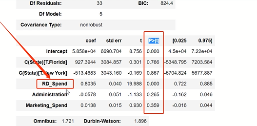 # 导入第三方模块 import numpy as np # 计算建模数据中因变量的均值 ybar=train.Profit.mean() # 统计变量个数和观测个数 p=model2.df_model n=train.shape[0] # 计算回归离差平⽅和 RSS=np.sum((model2.fittedvalues-ybar)**2) # 计算误差平⽅和 ESS=np.sum(model2.resid**2) # 计算F统计量的值 F=(RSS/p)/(ESS/(n-p-1)) print('F统计量的值:',F) F统计量的值:174.6372 # 导入模块 from scipy.stats import f # 计算F分布的理论值 F_Theroy = f.ppf(q=0.95, dfn = p,dfd = n-p-1) print('F分布的理论值为:',F_Theroy) out: F分布的理论值为: 2.5026 ''' 计算出来的F统计量值174.64远远⼤于F分布的理论值2.50 所以应当拒绝原假设(先假设模型不合理)
