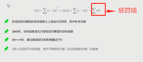 在线性回归模型的基础上添加了一个L2惩罚项(也叫做平方项或者正则项) # 该模型最终转变成求解圆柱体抛物线的焦点问题